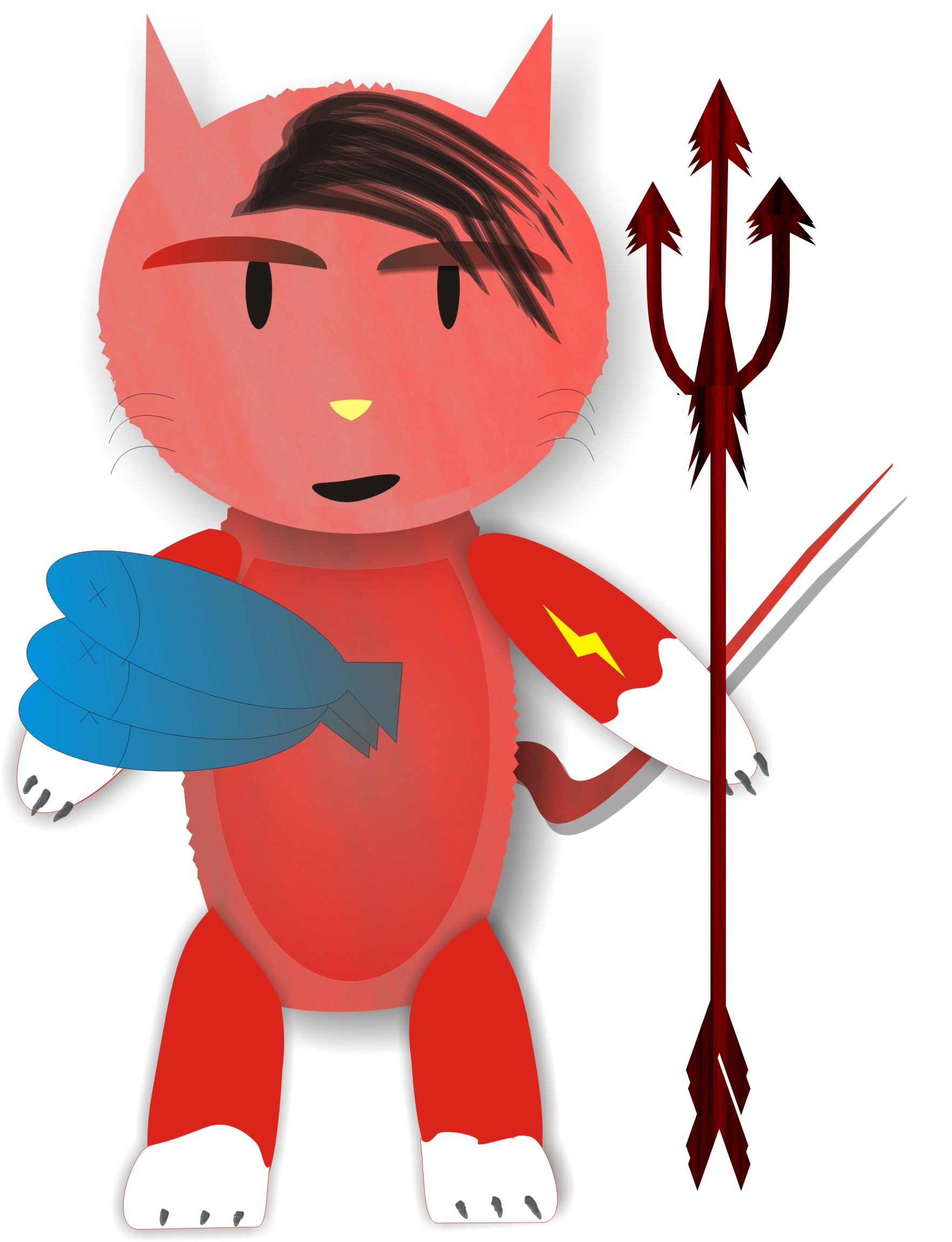 宮寶貓,愛吃魚,又燒掉了我兩個小時,在三杯貓的童話世界裡,魚=錢,看他的髮型跟手上的魚獲,就知道他不太缺錢,這隻全身紅紅的貓,畫起來真像閃電俠,原本想讓他跟三杯貓一樣走可愛路線,可是現在這樣畫好像有點太正派了,頭髮的效果還蠻有意思的,他可是三杯貓的死黨,不過這兩隻貓互為損友,沒辦法,貓就是這樣,至於他的三叉杖,有點散發惡魔的Fu!