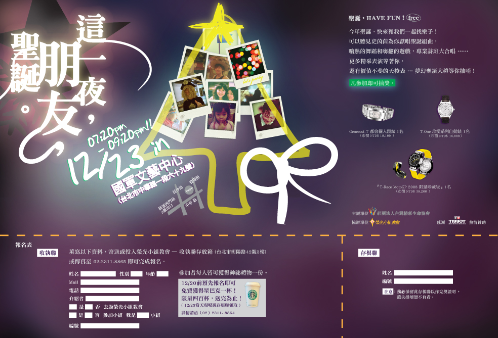 這是榮光小組教會在國軍英雄館舉辦聖誕節的DM,作的這麼漂亮,當然一定不是三杯貓作的啦!!看到部落格中這麼多人都在板上歡慶聖誕...不能只是宅在板上啦!一定要去教會走走逛逛喔!!詳細內容可以把這張DM下載來看看喔!