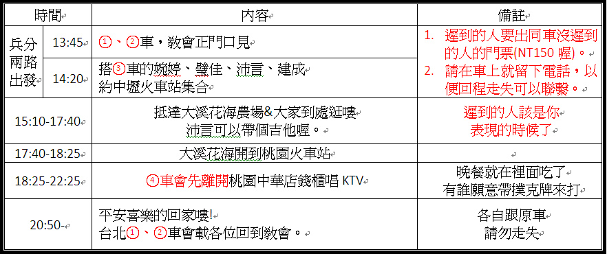 親愛的各位弟兄姊妹,很高興能邀請大家一同去桃園踏青喝茶,由於全程致力於有效率、有效果&有品質,所以定了下列規則,要拜託大家配合一下<(_ _)>